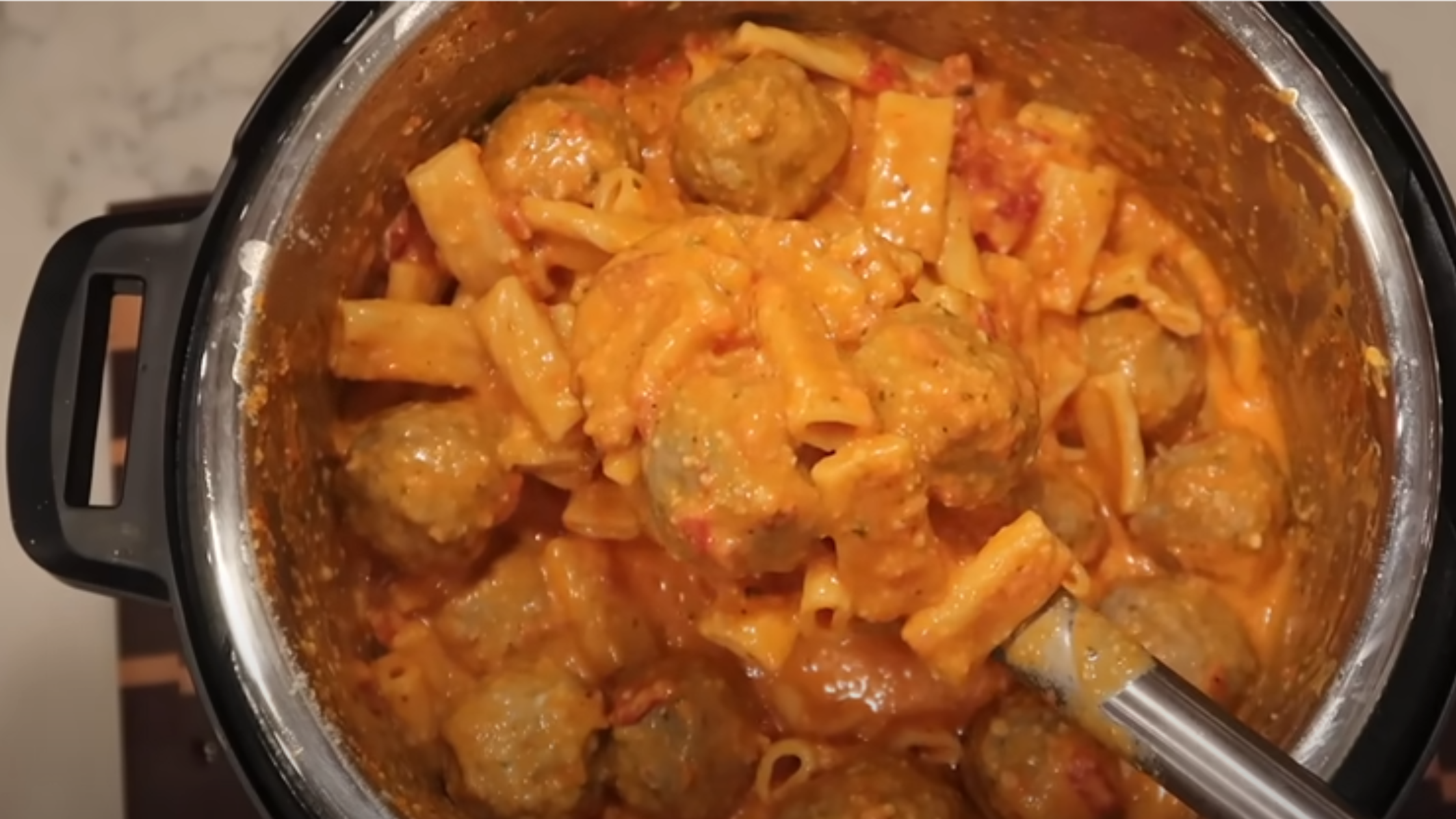 Once the cooking cycle is complete, do a quick release and open the lid. You’ll see perfectly cooked pasta and juicy meatballs. Give everything a gentle stir. The pasta may appear slightly collapsed—that’s actually ideal, as it absorbs the sauce better.